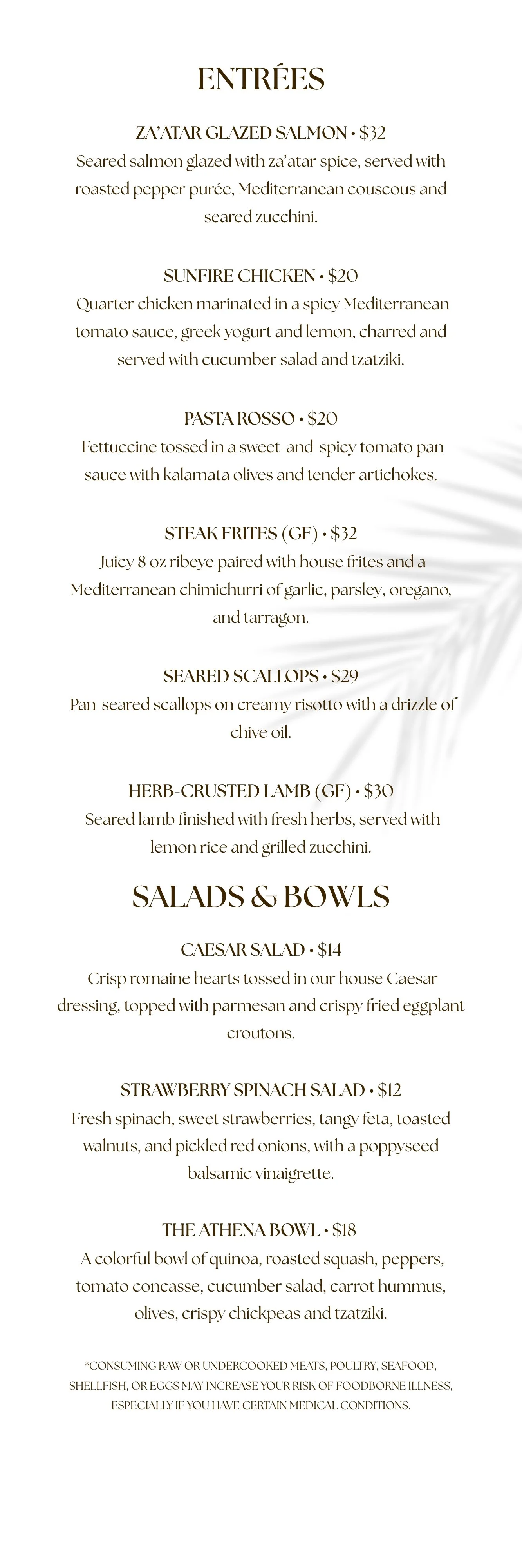 Menu with various entree and salad options, including glazed salmon, sunfire chicken, pasta rosso, steak frites, seared scallops, herb crusted lamb, Caesar salad, strawberry spinach salad, and Athena bowl, with prices listed.