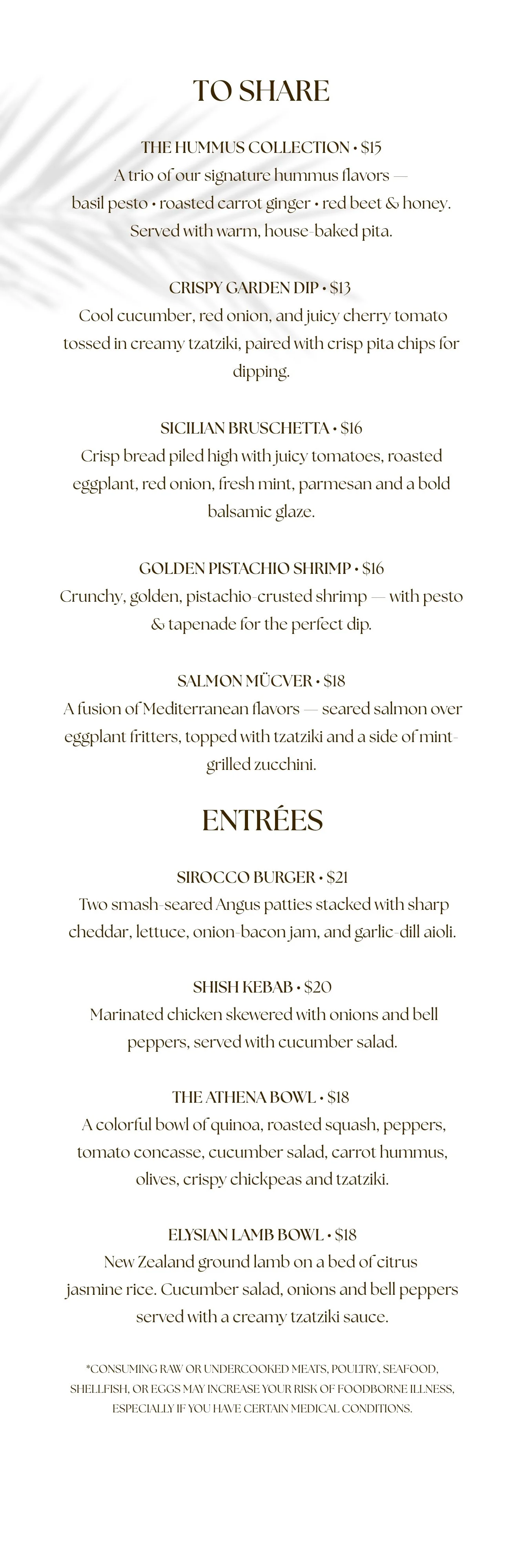 Restaurant menu featuring sharing options, appetizers, and entrees with dishes like hummus collection, garden dip, bruschetta, shrimp, salmon, burger, kebab, bowl options, and lamb dishes.